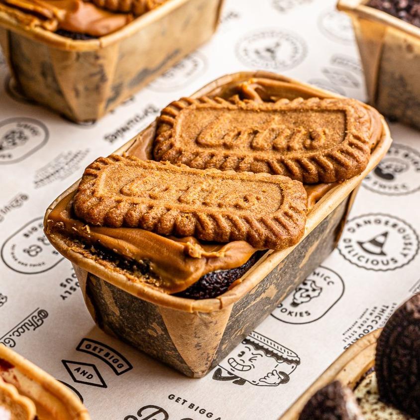 Lotus Biscoff (Vegan), aka cookie butter, aka speculoos cookie crumb butter aka the bomb.com filled inside and slathered on top of our chocolate brownie slapped on with Lotus biscuits.